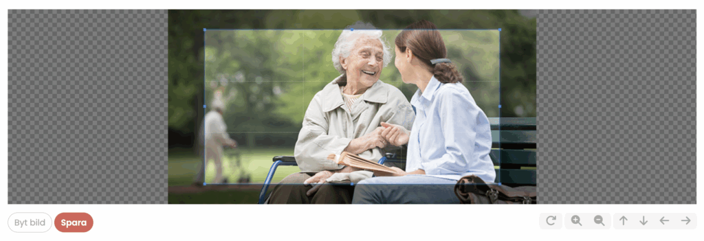 Klicka på Lägg till en ny bild och leta upp bilden du vill lägga upp. Notera att det inte går att lägga upp mer än en bild i taget. När du har öppnat bilden i Recruto har du kommit in i redigeringsläget. Du kan anpassa bilden genom att dra i bildmarkeringen eller använda förstoringsglas och pilar. När du är nöjd med bilden trycker du på Spara och sen Spara en gång till. Nu finns den nya bilden i Bildbanken