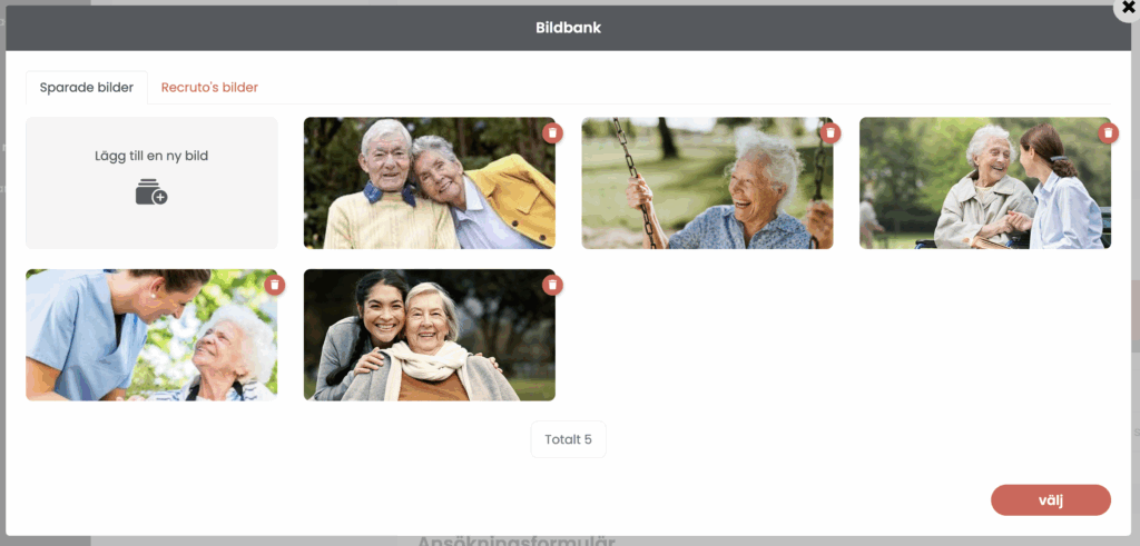 När du klickar på Ändra hamnar du i bildbanken som består av två delar: Sparade bilder och Recrutos bilder. Under Sparade bilder finns era egna bilder som ni laddat upp, eller kommer att ladda upp.