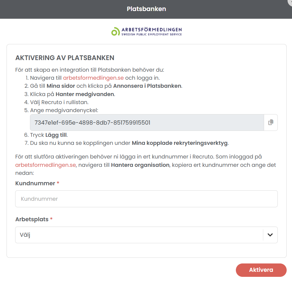 För att slutföra aktiveringen behöver ni lägga in ert kundnummer i Recruto. Som inloggad på arbetsformedlingen.se, navigera till Hantera organisation, kopiera ert kundnummer och ange det i tilläggets inställningar (se bild nedan).
